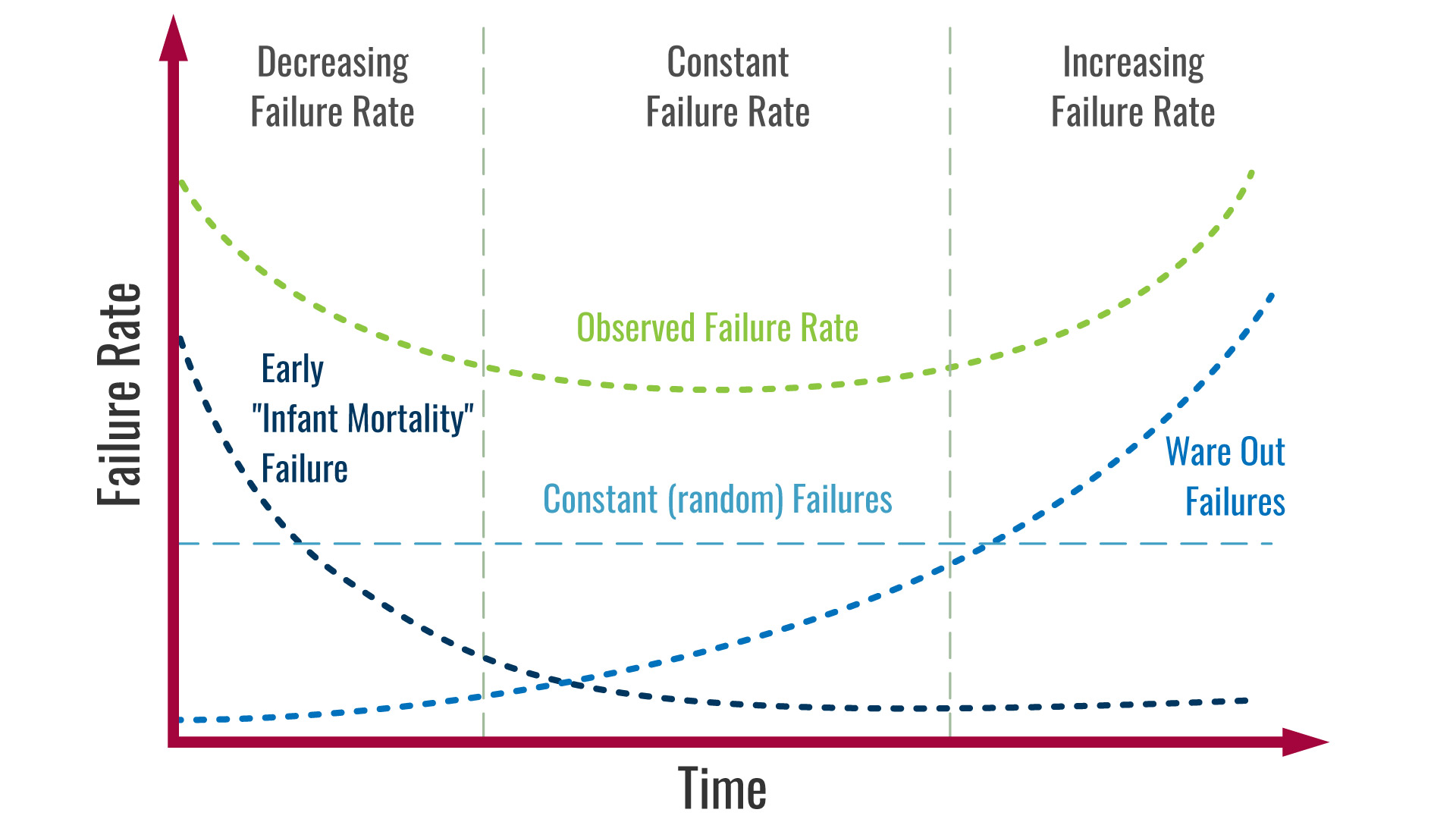 During this phase, the failure rate remains relatively constant throughout the product’s useful life. Reliability is typically expressed using FITs (Failures in Time) or as MTBF (Mean Time Between Failures) measured in hours.