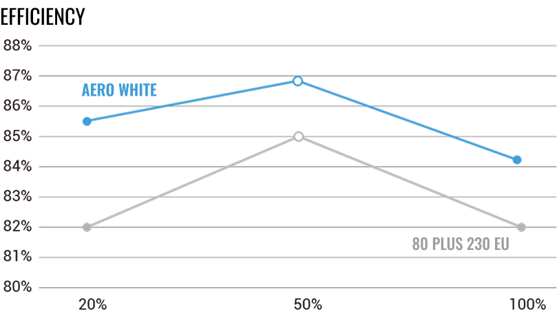 The AeroCool AERO WHITE is an AC-to-DC switching power supply unit built for the Intel ATX 3.1 multi-rail desktop platform. It features Active Power Factor Correction (APFC) and a Switching Double Forward design for reliable power delivery. With a synchronous rectifier and step-down DC-to-DC conversion for the 3.3V and 5V rails, it ensures stable output and improved efficiency. Certified 80 PLUS 230V EU WHITE, the AERO WHITE offers dependable performance for mainstream PC builds.