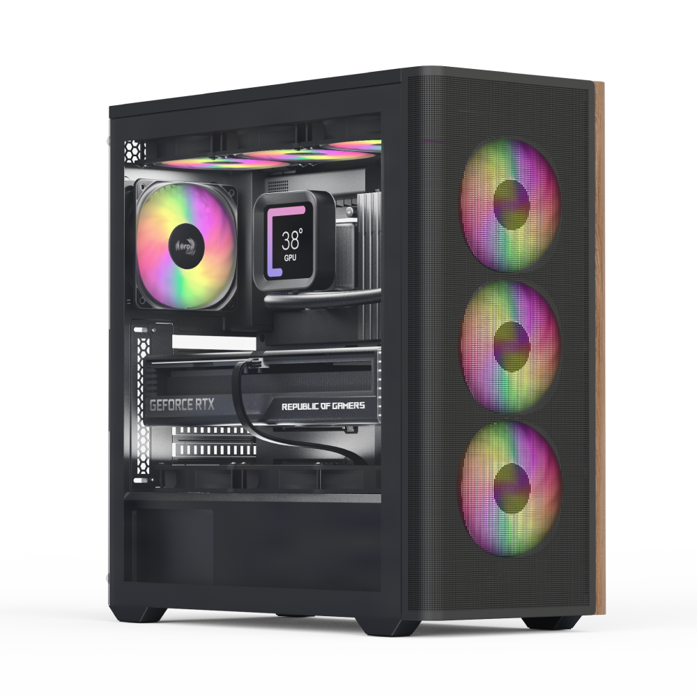 The AeroCool D501A features a wood-accented mesh front panel design, making it an appealing choice for a trendy mid-tower PC build. It supports liquid coolers up to 360mm and offers 11 fan slots, ensuring excellent cooling potential. With durable SPCC body material, magnetic dust filters, and compatibility with ATX, Micro ATX, and mini-ITX motherboards, the D501A provides robust construction, easy maintenance, and versatile storage options.