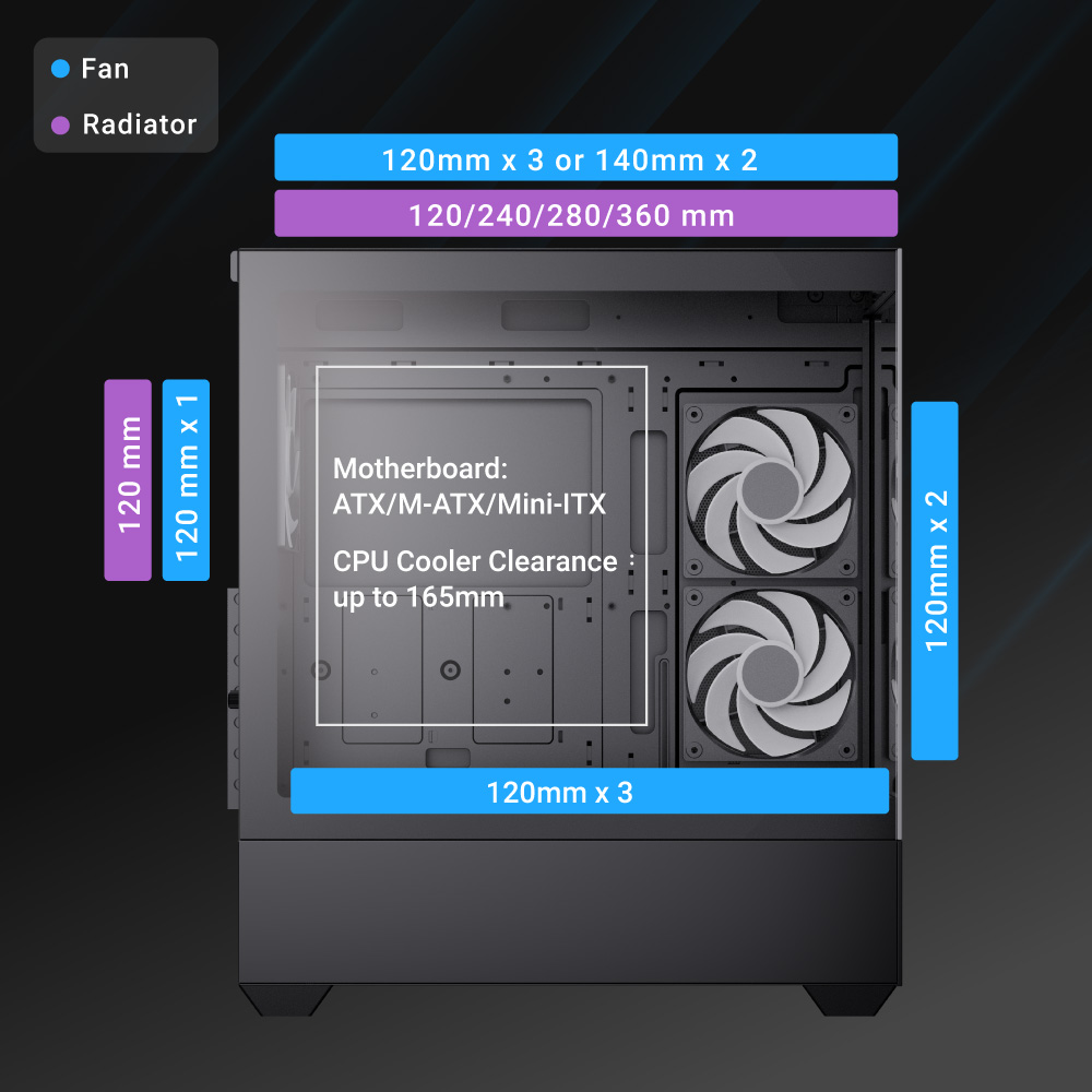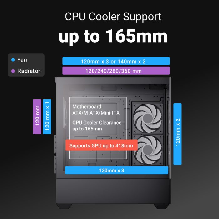 • Fits CPU air coolers up to 165mm for powerful and quiet cooling