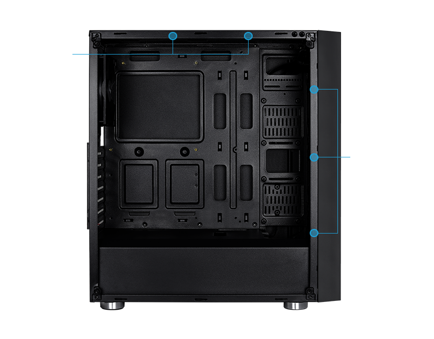 Built with a dual chamber design to direct heat away from the main chamber for more effective all-around cooling. Supports air cooling in the front, top, and rear of the case to enhance cooling performance. • Front: 120mm x 3 (Addressable RGB Fans Included) Supports liquid cooling in the front and top panels. • Front Panel: Up to 360mm Radiator (Optional) Rear fan can be adjusted for 5 different positions, giving you more freedom for modifications or installing a thicker radiator.